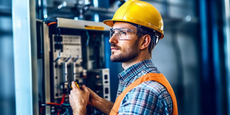Engineer in hard hat operating control panel in industrial setting, technology concept