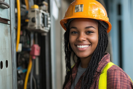 Black woman technician in a hard hat and gloves meticulously working on complex industrial electrical control panel, ensuring precision and safety.