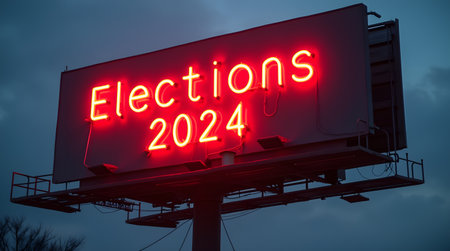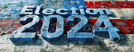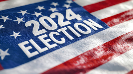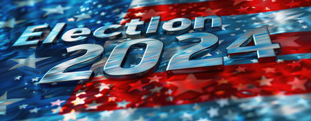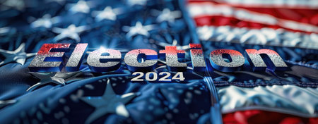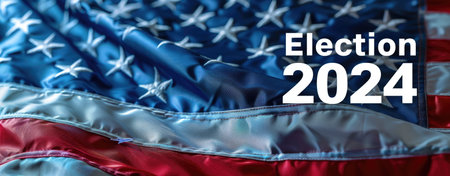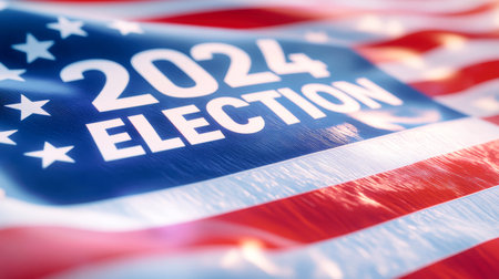The iconic American flag waves gracefully in the wind, boldly featuring 2024 ELECTION in striking white text against a vibrant backdrop of red and blue.
