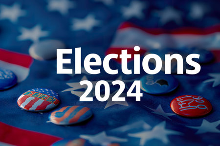 A shiny voting button, marked for the 2024 presidential election, rests against a smooth surface, framed by the iconic US Capitol and waving American flag.