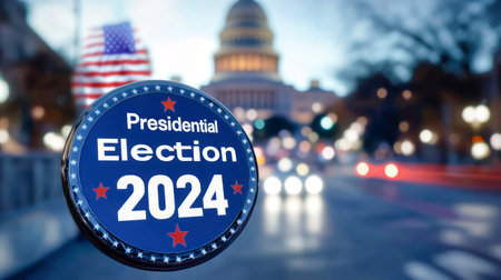 A vibrant campaign button showcases the Presidential Election 2024 surrounded by an energetic atmosphere, featuring the American flag and the US Capitol in the distance.