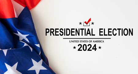 Presidential Election 2024 text on white paper over the American Flag. Politics and voting conceptual.