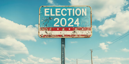 Election 2024 vintage road sign with blue sky and white clouds background