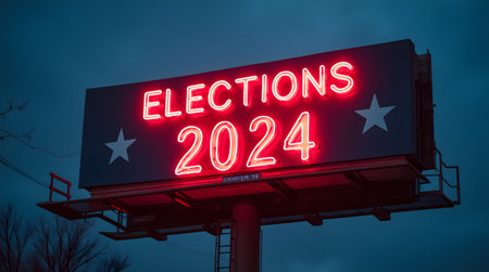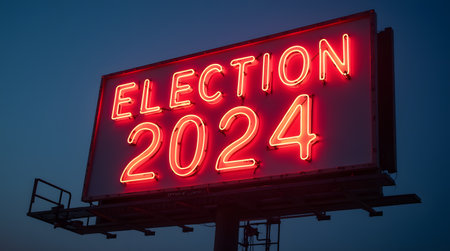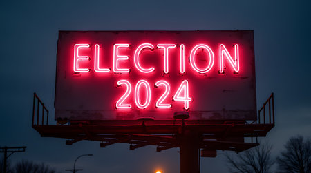Election 2020 on billboard at night with traffic lights. Selective focus.