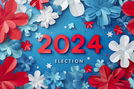 colorful paper craft flowers and 2024 election text on blue background.