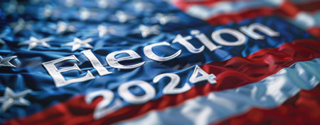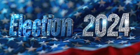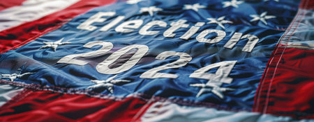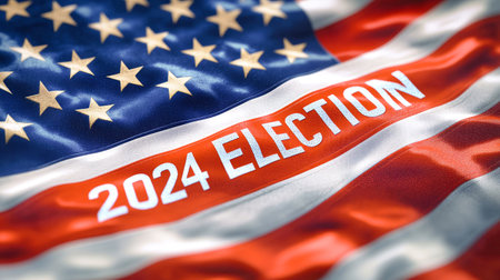 A highly detailed 3D American flag emblazoned with the words 2024 election, surrounded by a gently waving backdrop, reflecting national pride.