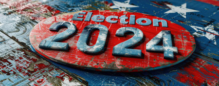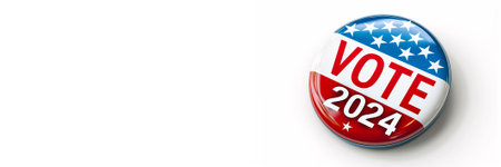 Close-up of a Vote 2024 button with patriotic stars and American flag background, symbolizing US presidential election, political participation, and civic duty.