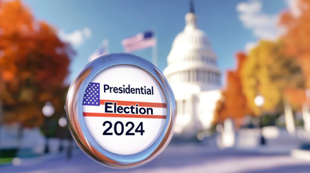 A vibrant campaign button for the upcoming Presidential Election 2024 stands prominently with the US Capitol in the background, evoking a spirited election atmosphere.