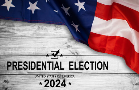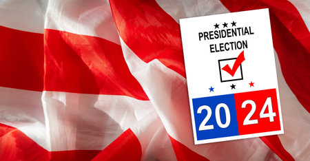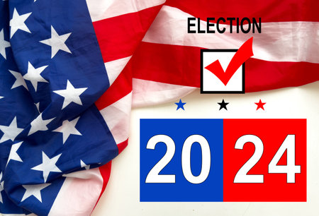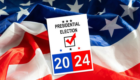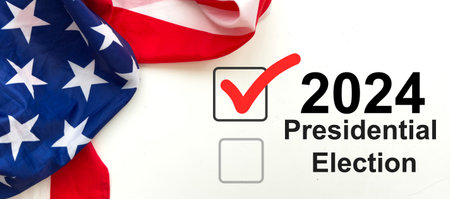 Politics and voting concept. Presidential election 2024 text on white paper over the American flag background
