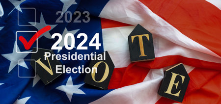 Vote 2024, Presidential Election with USA American flag on wooden background