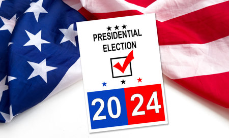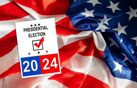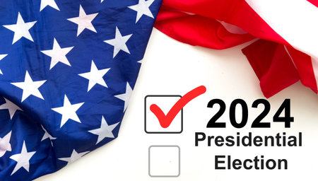 Presidential Election 2024 text on white paper over the American Flag. Politics and voting conceptual.