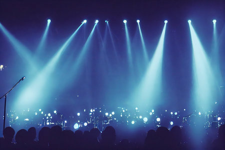 Audience crowd people at abstract concert with bright lights background digital illustration