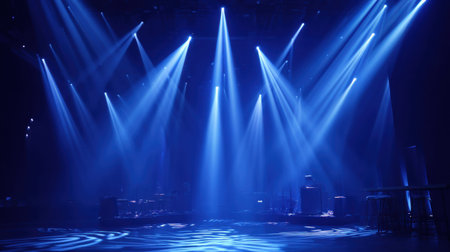 Bright concert lights illuminate the empty stage creating a vibrant atmosphere as beams cut through the darkness in a large venue.