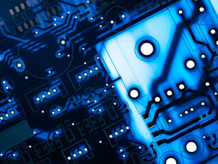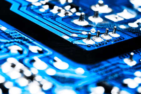 PCB concept. Abstract printed circuit Board. Bright electronic background. Computer components. Close-up of a printed circuit Board fragment.