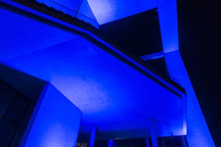 Architectural feature in blue tones during light and cultural festival night scenes and night life along River Spree illuminated buildings and reflected colors on calm water under dark sky.