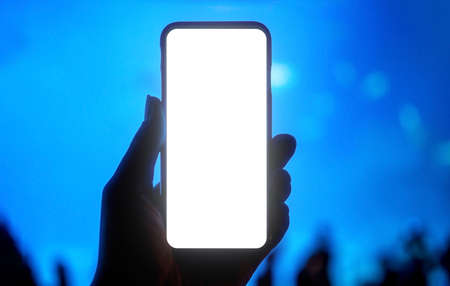 Hand with the smartphone turned on to record or take pictures during the live concert