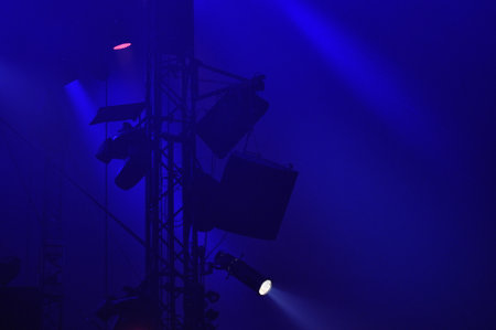 Stage lights on concert. Lighting equipment with multicolored beams.
