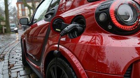 Electric car being charged on a rainy day, close-up of the power connector and charging port.