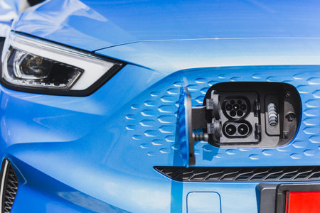 Close up view of vehicle electric charging socket plug in to recharge in Bangkok, Thailand.