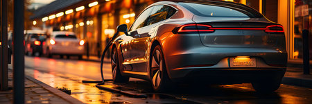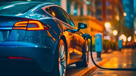 Electric Vehicle Charging on City Street, Sustainable Transportation and Urban Mobility.