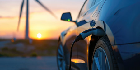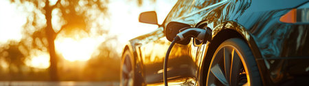 Electric car charging at sunset in a serene environment, showcasing modern technology and sustainability in a vibrant color palette