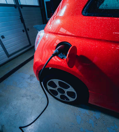 Electric vehicle EV car Power cable with pump plug in charging power, innovation alternative sustainable eco energy.