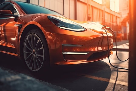 An AI generated illustration of a glossy electric car parked at a charging station, waiting to be powered up
