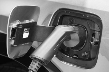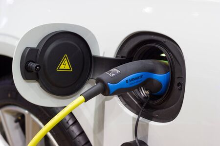 Close up view of vehicle electric charging socket plug in to recharge in Bangkok, Thailand.