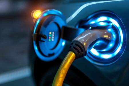 Close-up of an electric vehicle's charging port while being connected to a modern charging station, emphasizing the simplicity and efficiency of electric car technology