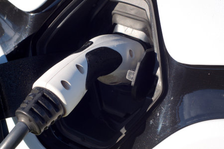 Close up image of the power socket of an electric car, charging.