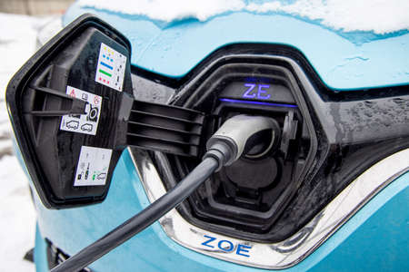 Charger plug inserted in electric car on snowy winter background. Green energy.