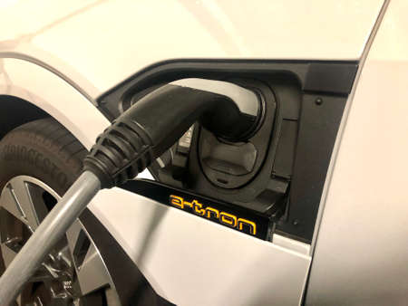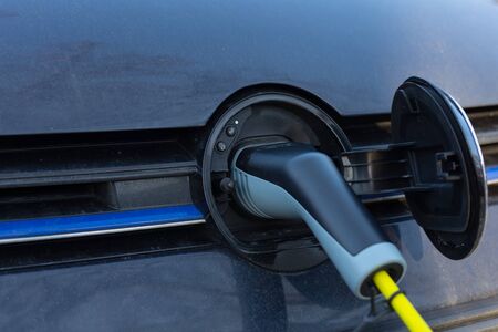 Electric car charging. Electric vehicle EV hybrid car with charging connector. Power cable pump plug in charging power to electric vehicle EV car. Eco energy. Electric car during charging.