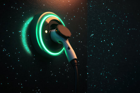 Modern electric vehicle charger connected to a wall socket, featuring a glowing green ring, set against a dark starry background.
