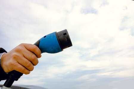 Close-up hand grip plug of industrial electric charging machine connected with socket charge on white electric car for rechargeable battery, zero emission vehicle and green energy for smart life