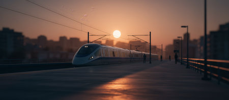 High speed train arriving at a modern urban station platform with several passengers waiting at sunset, reflecting the warm orange light on the ground, representing modern transportation and travel