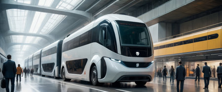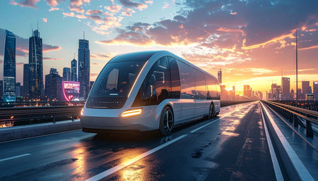 Future of public transportation: Electric vehicles on futuristic cityscape background.