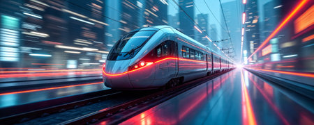 Sleek high-speed train races past modern skyscrapers during sunset, casting vibrant trail lights the tracks in bustling urban environment. The warm colors enhance the dynamic atmosphere of city life