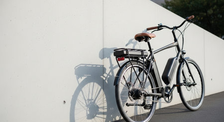 A modern black electric bicycle with a brown leather seat leans against a textured concrete wall, casting a detailed shadow. The scene is bathed in soft, natural light.