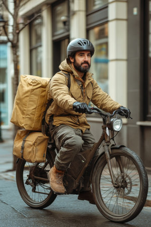 A cyclist navigates a wet urban street on a rainy day, wearing a helmet and a cozy jacket. He carries large packages on his bike, showcasing the hustle of city delivery services in a bustling atmosphere.
