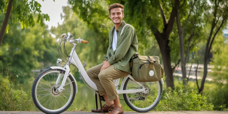 Handsome young man riding ebike in nature