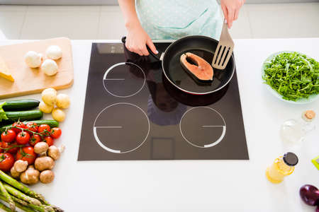 Top view of nice skilled girl cooking fresh homemade meal cuisine enjoying ocean food at home light white kitchen indoors