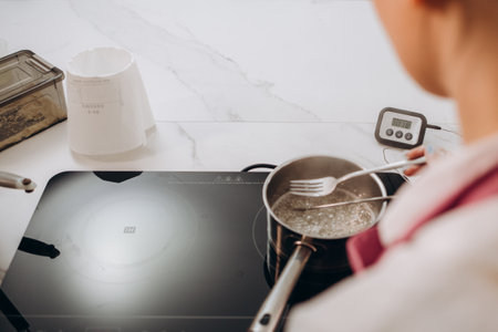 Saucepan ladle with lid on an induction hob built into a wooden kitchen worktop, top view