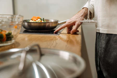 Modern kitchen appliance. Woman hand turn on induction stove to cook. Finger touching sensor button on induction or electrical hob