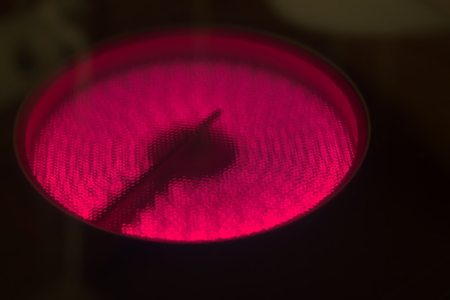 Red circle electric stove powered up, red hotplate glows red, being on. Close up.