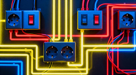 This dynamic illustration showcases a bold and energetic style through the use of vibrant colors and a studio lighting effect. Ideal for educational materials, technical presentations, or creative projects in the electrical industry. The abstract approach adds a modern flair, making it suitable for both digital and print media. AI-generated illustration.