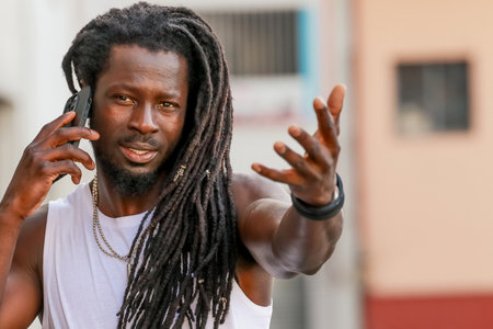young man with afro hair or dreadlocks talking on mobile phone on the street