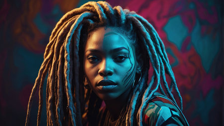 Fashion portrait of young beautiful african american woman with dreadlocks in neon light.