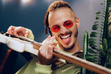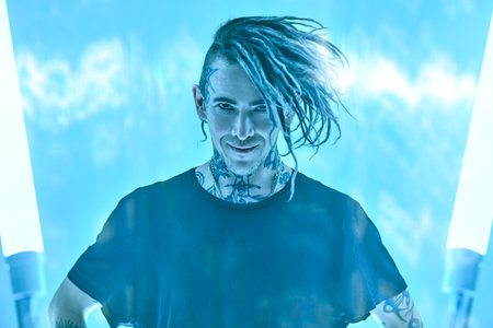 Space punk rock music. Modern punk rock musician with dreadlocks in stylish black clothes poses among neon lamps. Youth alternative culture.