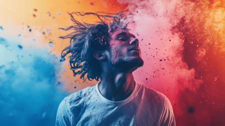 A dynamic portrait of a man surrounded by colorful powder explosions, blending vibrant hues of blue, orange, and pink in motion.
