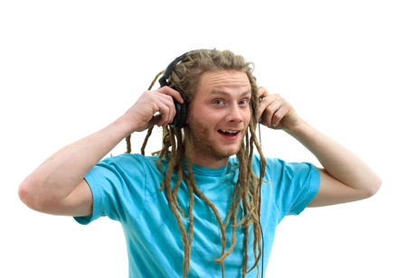 Portrait of a Young Man with Dreadlocks Listening to Music on Headphones